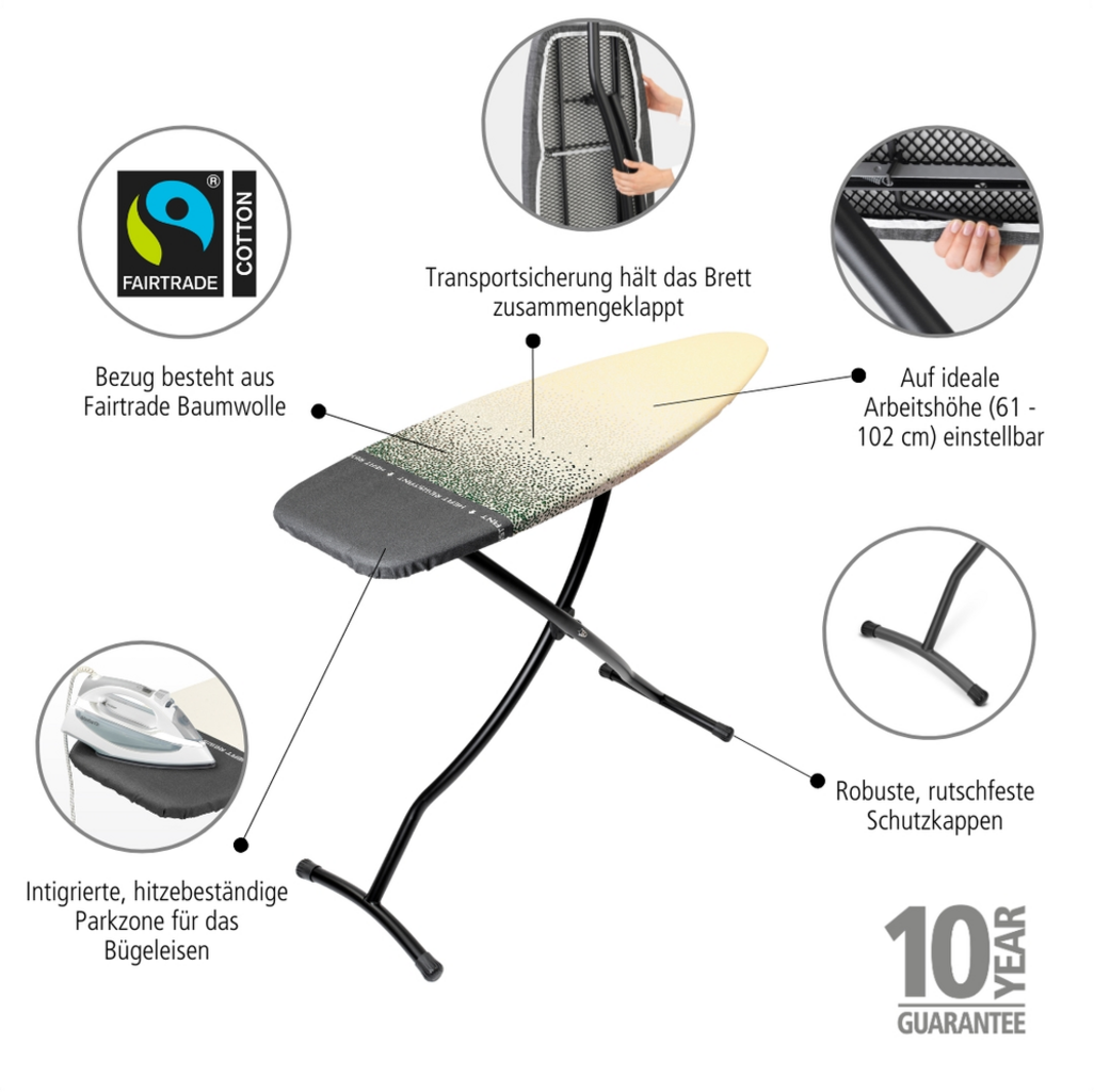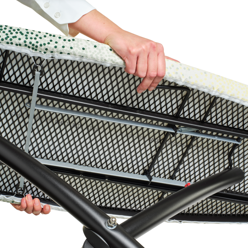 Dodatkowa szerokość i długość dla większego komfortu podczas prasowania. Kształt deski ułatwia skuteczne prasowanie bluzek, koszul i spodni. Zintegrowana, odporna na ciepło strefa przechowywania zastępuje zwykły uchwyt.
