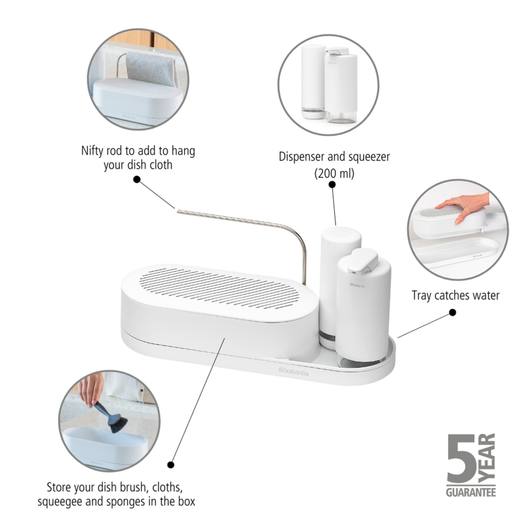 Zawsze idealny porządek! Kompaktowy organizer nie tylko wizualnie zapewnia porządek w zlewie, ale także oferuje wystarczająco dużo miejsca na gąbki, szczotki do mycia naczyń, ściereczki i wiele innych. W dwóch dozownikach znajduje się miejsce na mydło do rąk i płyn do mycia naczyń.