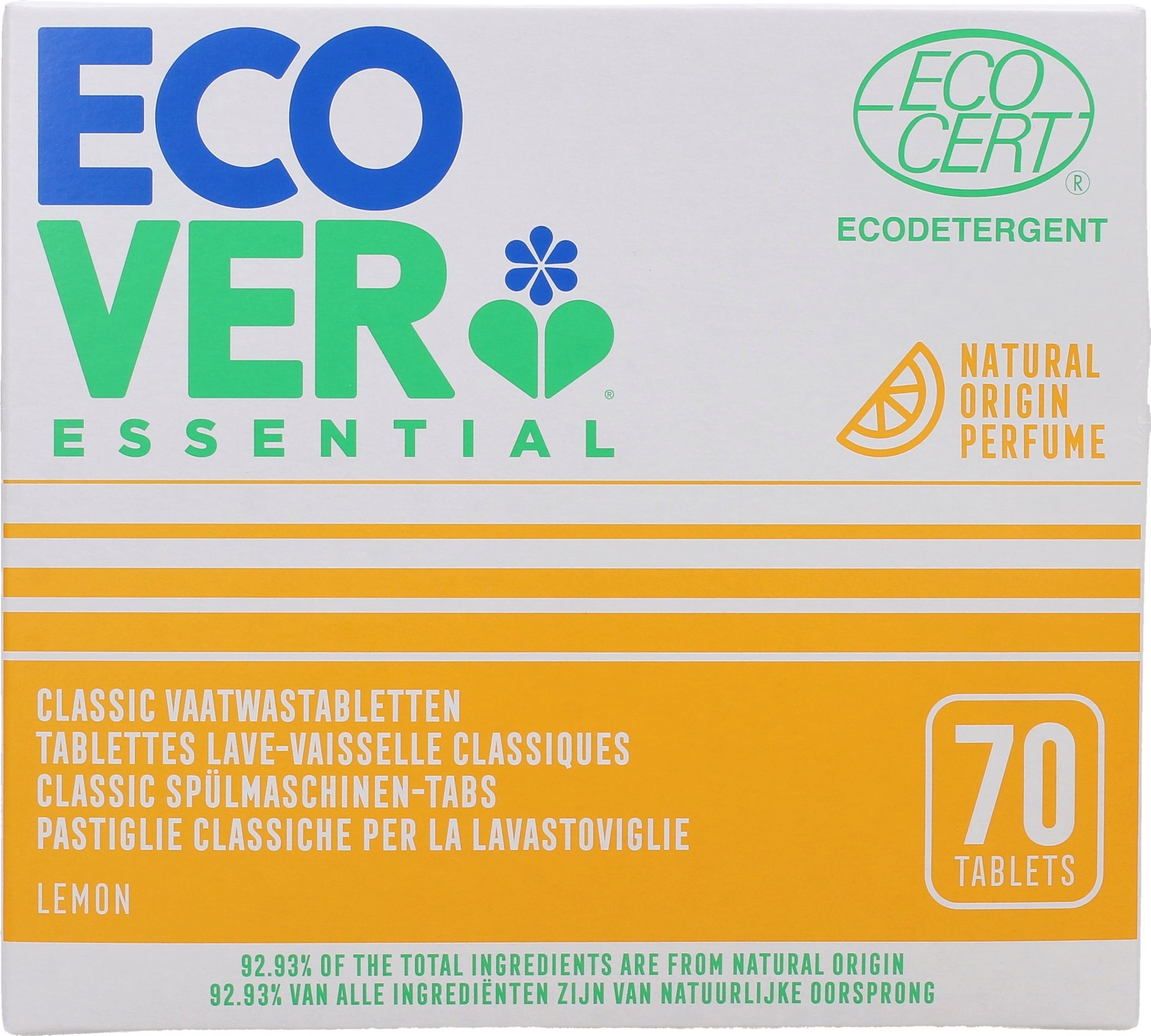 Tabletki do zmywarek z linii Essential firmy Ecover charakteryzują się wysoką mocą czyszczenia opartą na składnikach roślinnych i mineralnych. Zapach cytrusowy oparty jest na naturalnych zapachach.