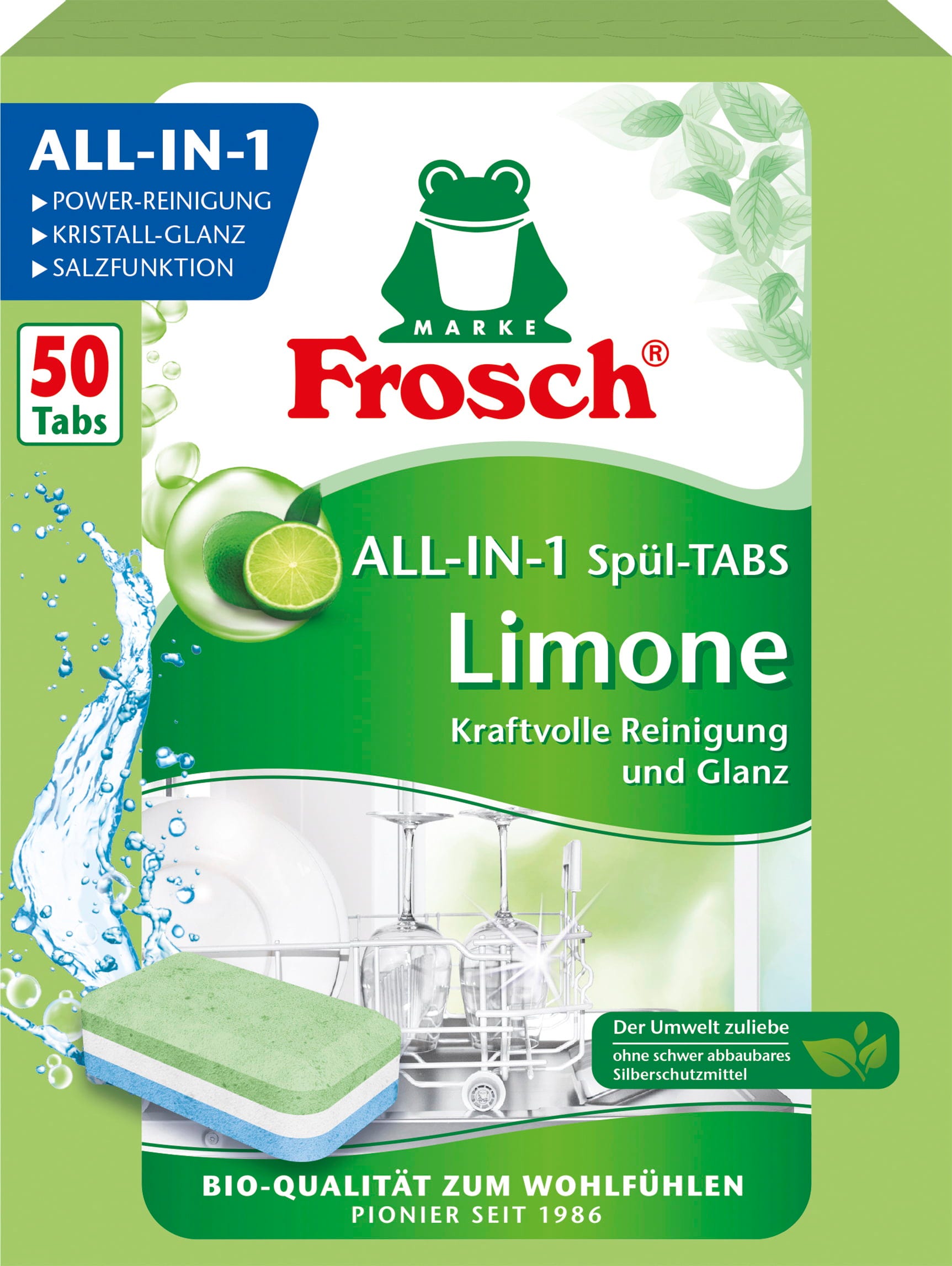 Tabletki do mycia naczyń Frosch „ All in 1” wykorzystują ekstrakt z limonki, aby w mgnieniu oka usunąć nawet najbardziej uporczywe naloty i tłuszcz, a także wydzielają delikatny limonkowy zapach.