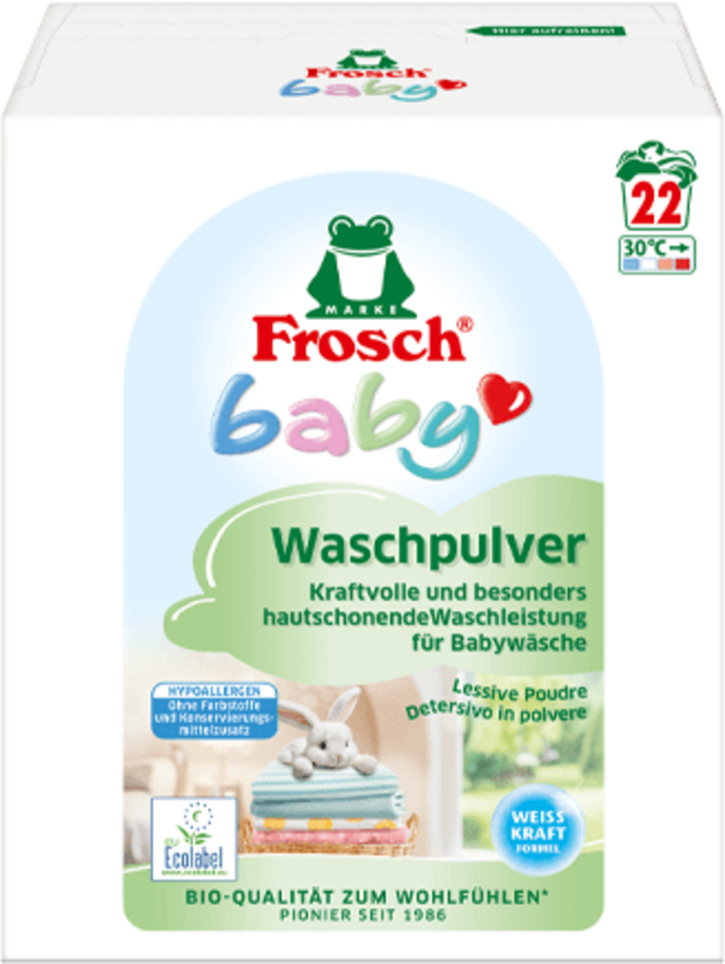 Proszek do prania dla dzieci Frosch przeznaczony jest do prania białego i gotowanego i można go stosować w temperaturach od 30°C do 95°C. Posiada dużą moc i błyskawicznie usuwa wszelkiego rodzaju zabrudzenia.