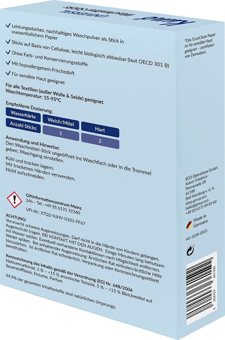 Pałeczki detergentu są skoncentrowaną i kompaktową alternatywą dla konwencjonalnych produktów w proszku i płynie i zapewniają skuteczne oczyszczanie. Nie zawierają barwników ani konserwantów i są całkowicie biodegradowalne. Są odpowiednie do wszystkich tkanin z wyjątkiem wełny i jedwabiu. Ich hipoalergiczny, świeży zapach jest dużym plusem, a także jest odpowiedni dla wrażliwej skóry.