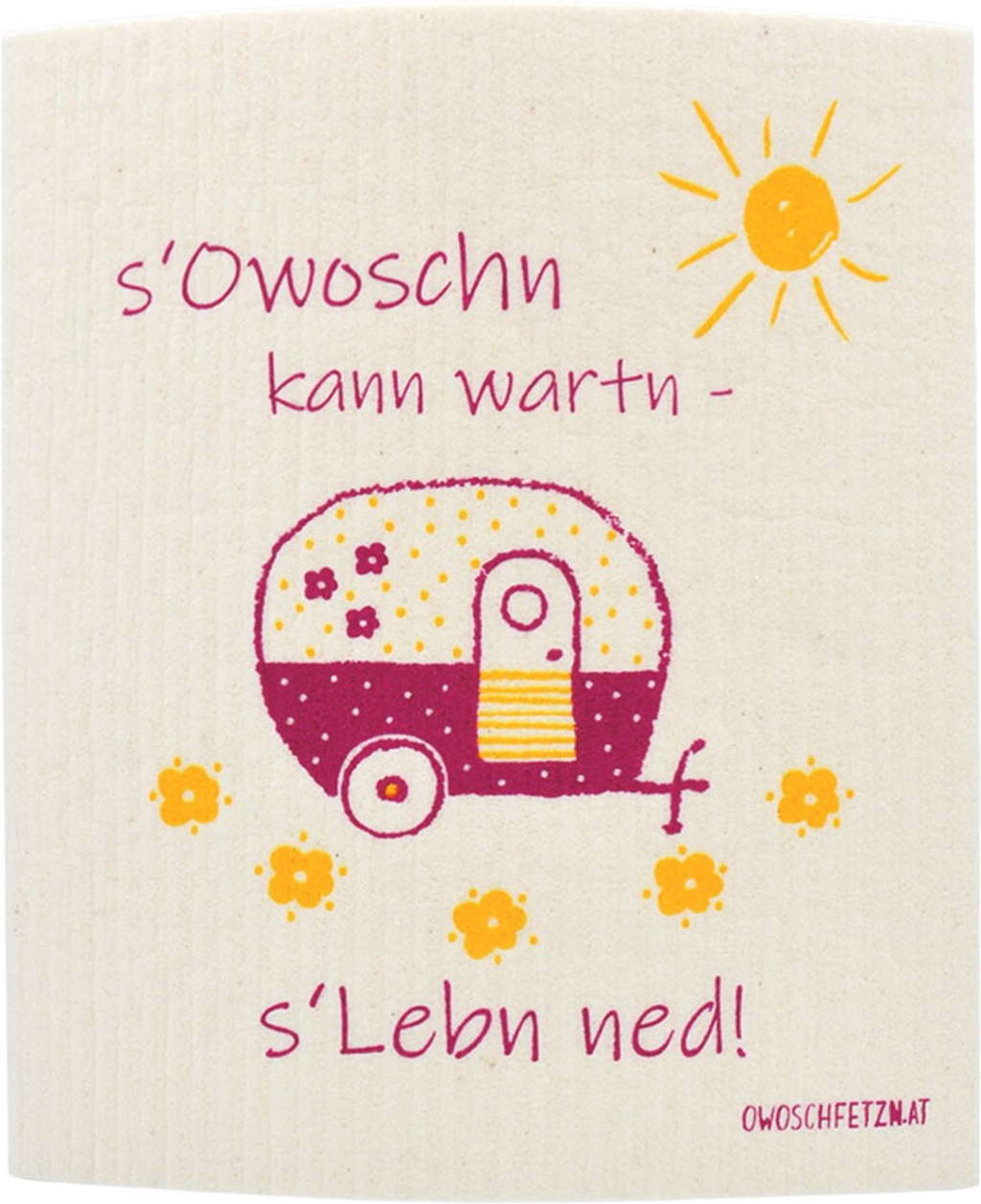 OWOSCHFETZN Ściereczka gąbkowa Camper "s'Owoschn kann wartn - s'Lebn ned!", różowy/żółty