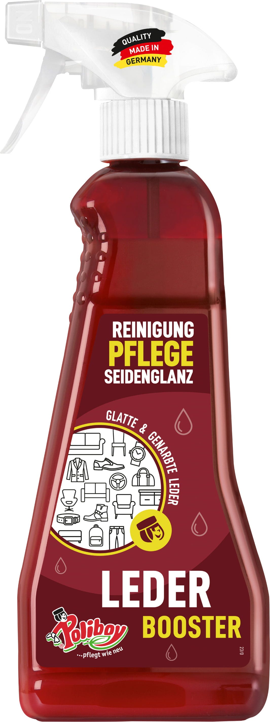 Booster dla skóry od Poliboy nadaje się do mebli, toreb, odzieży, butów, akcesoriów jeździeckich i motocyklowych oraz wszystkich akcesoriów ze skóry naturalnej. Usuwa brud, wzmacnia skórę i nadaje jej piękny jedwabisty połysk. Przyjemny zapach tworzy również przyjemną atmosferę.