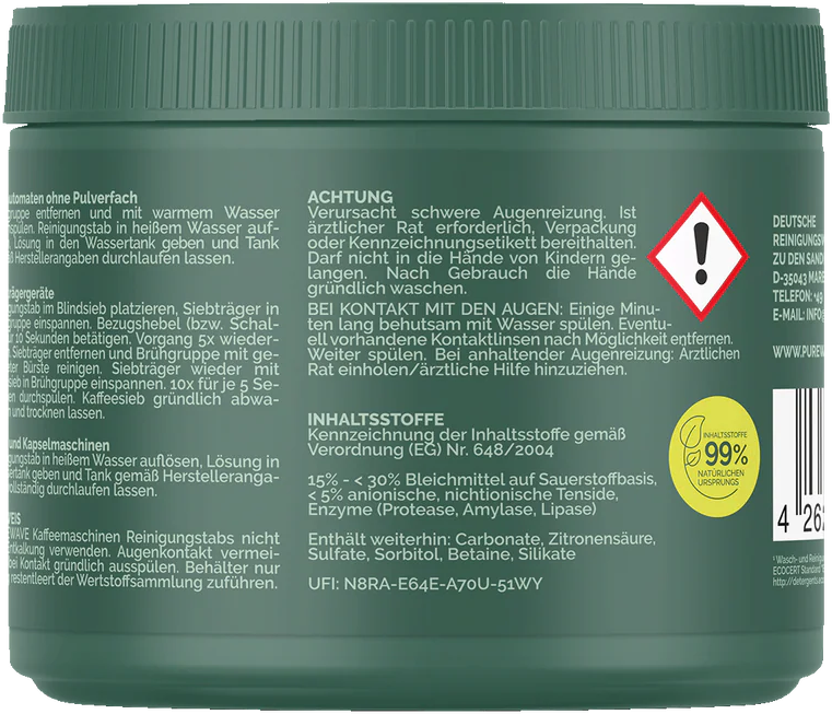 Opakowanie: Puszka i pokrywka tabletek czyszczących są wykonane z przyjaznego dla środowiska zielonego PE (trzcina cukrowa) i w 100% nadają się do recyklingu.